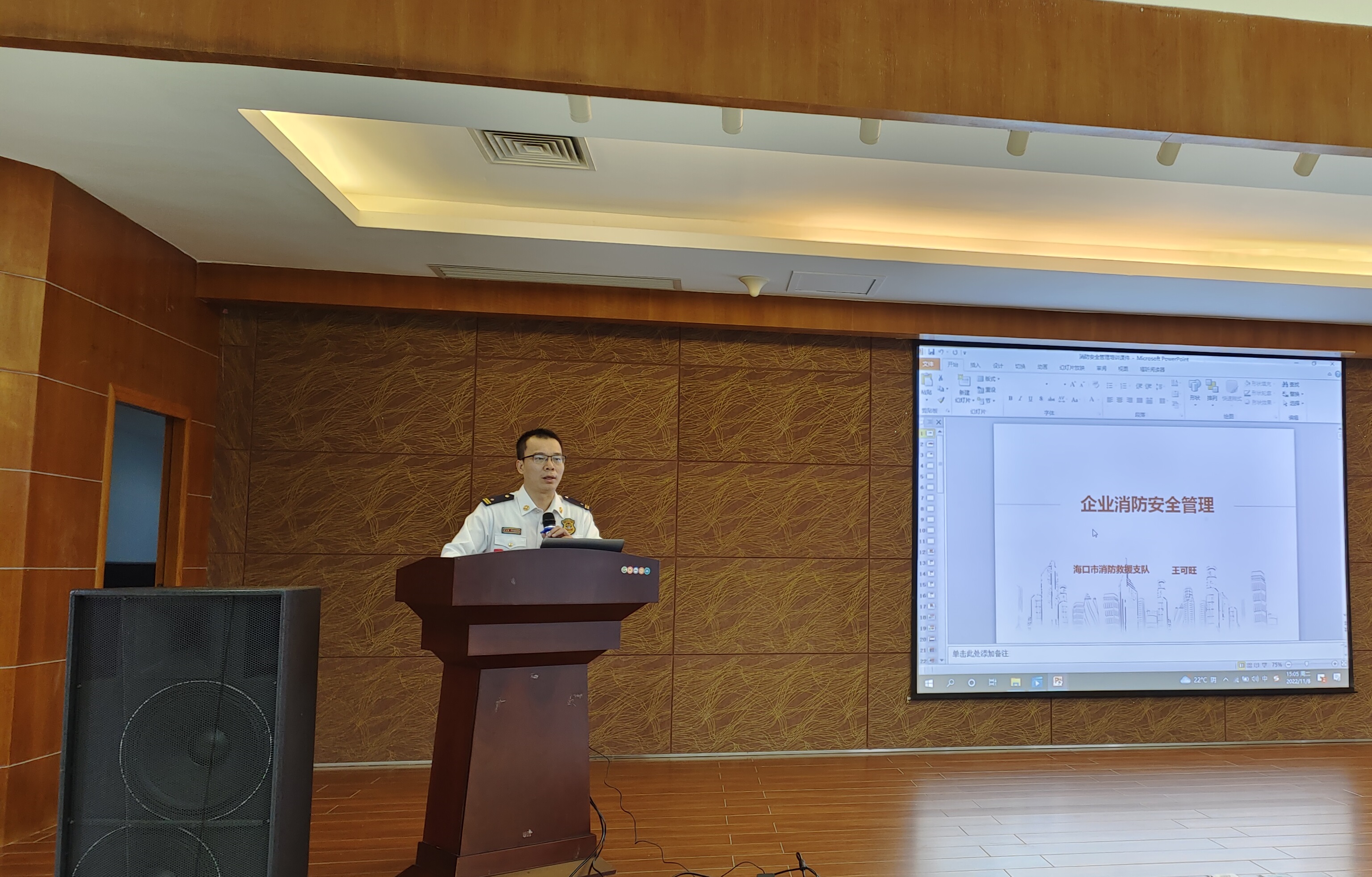 海口消防園區(qū)派駐組王可旺參謀為與會人員進行消防培訓(xùn)