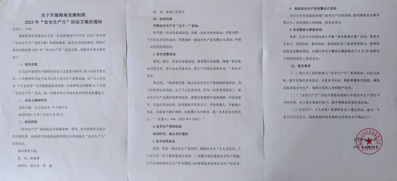 根據(jù)國家、省、市、區(qū)相關(guān)文件精神,結(jié)合公司實(shí)際,海南皇隆制藥股份有限公司制定了2023年“安全生產(chǎn)月”活動方案,并開展了以“人人講安全,個個會應(yīng)急”為主題的系列活動,進(jìn)一步提升了公司全員安全意識和應(yīng)急處置能力。